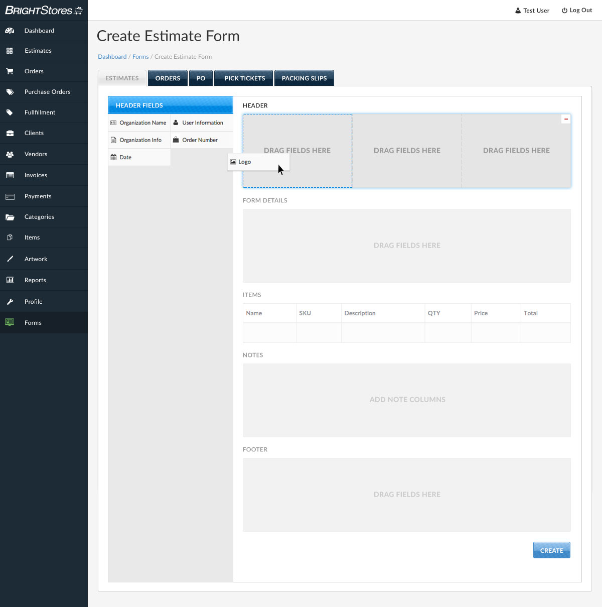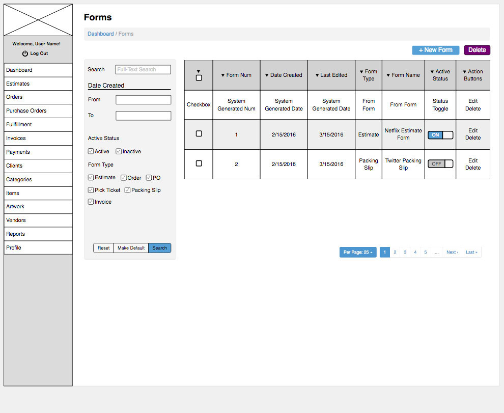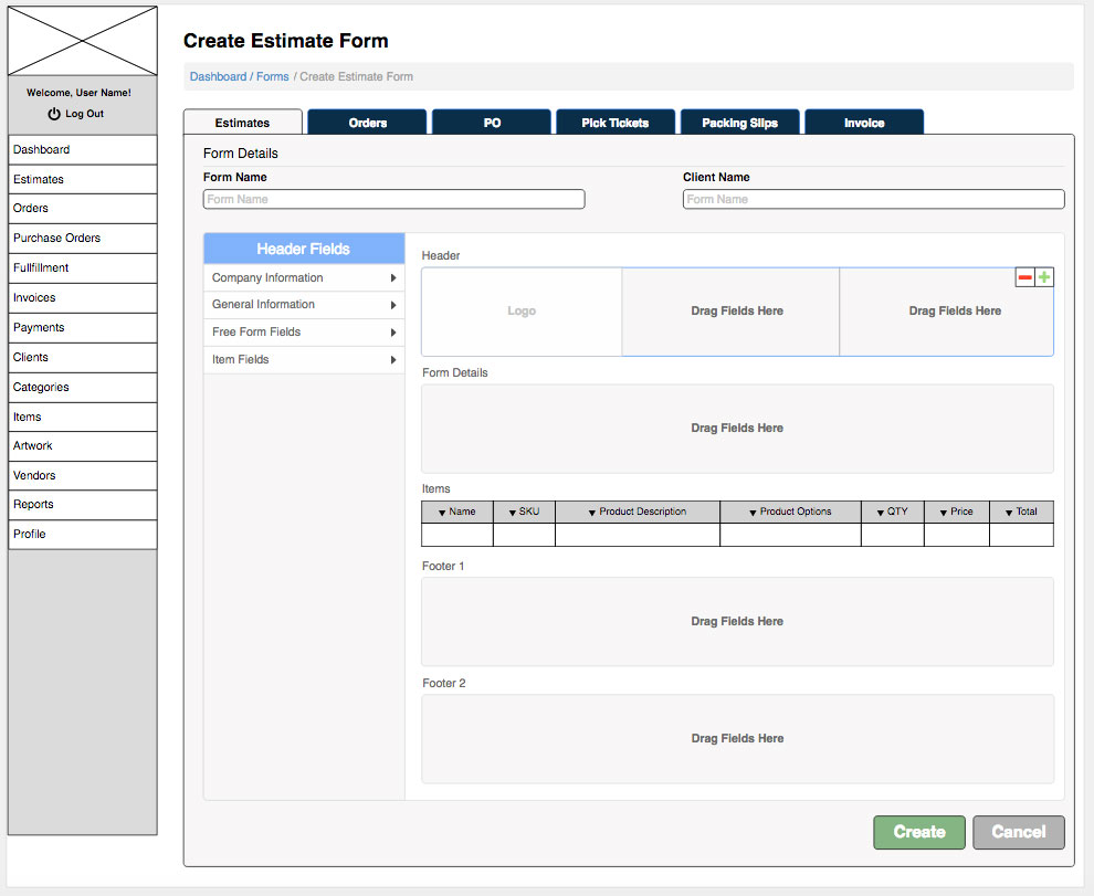 UI/UX design for an order processing system. Shown below is the form creation functionality. Wireframes were created to conceptualize the product and then designed with Photoshop. InVision was used to help developers build out the pages.