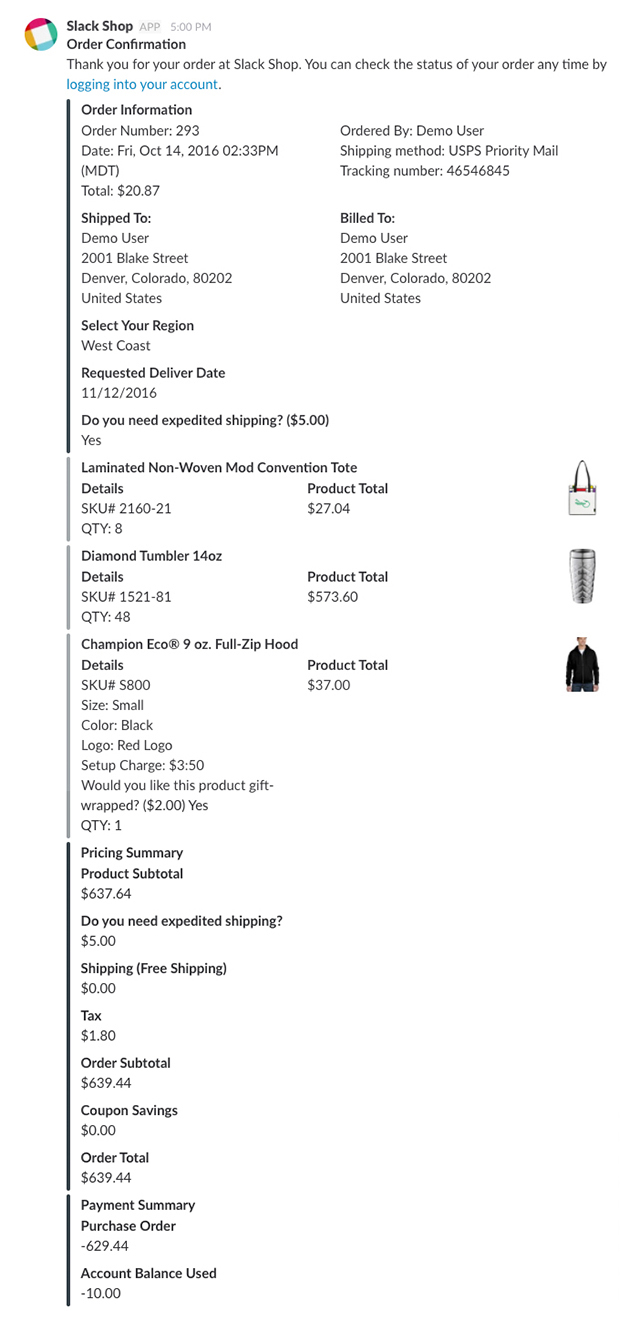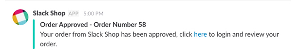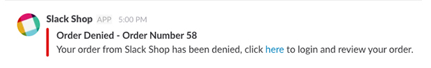 Limited by Slack's minimalistic message formatting, it was a fun challenge to fit in all the necessary information from an order. Message layouts were created for Order Confirmations, Shipping Confirmations, and Order Approved/Denied.